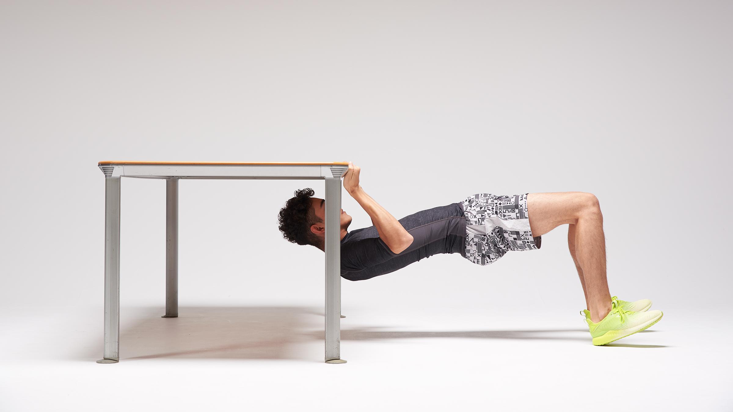 テーブルの下に頭を入れて座り、天板の縁を逆手で握る。両足は腰幅に開き、膝は曲げた状態。そこから腕の力だけでカラダを引き上げる。肘を後ろに引くと背中の筋肉が使われてしまうので注意。10秒キープ×3セット。
