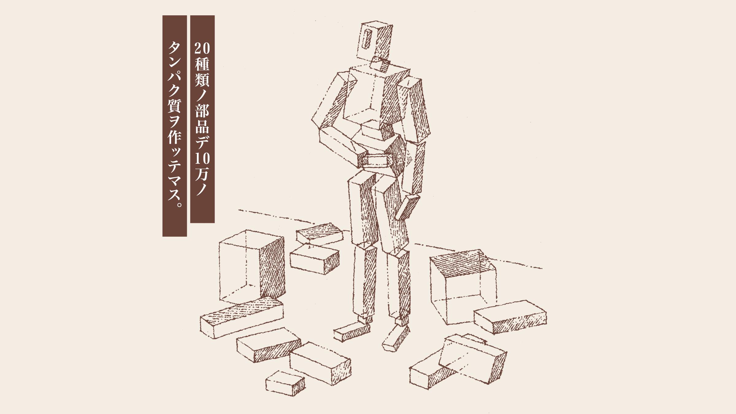 カラダを覆う皮膚や毛、一皮剝いた内側にある筋肉や内臓、さらにその中に張り巡らされている血管、血液中を流れる色素成分、ホルモン、各種酵素に至るまで、すべてタンパク質で構成されている。その重量は体重の約20%、数にして数万から10万種類。