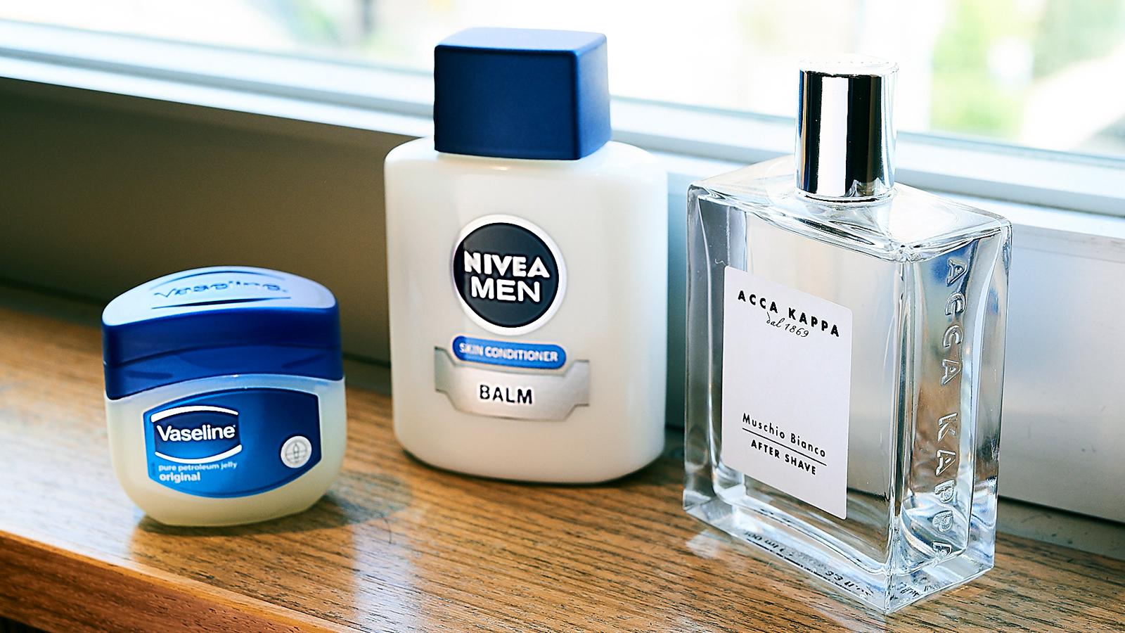 「一番右は、イタリアの老舗〈アッカ・カッパ〉のローション。化粧水感覚で使えるシャバシャバ系で、つけた後もピリピリしないところがいい。髭剃り後、顔全体につけてしまって大丈夫です。それから優しくパッティングしながら、肌に浸透させれば、徐々にモチモチした質感になっていきますよ」