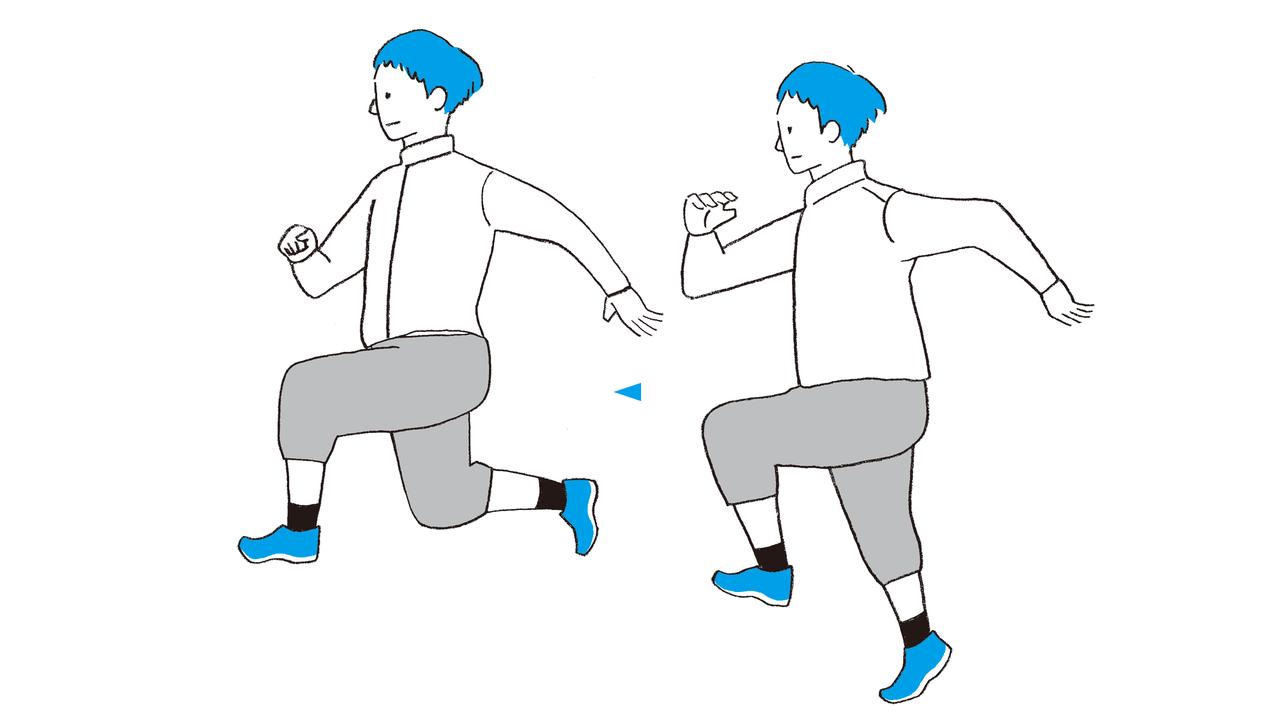 ランニングモーションの旨みが全部詰まったスキップ。脚が後ろに流れてしまいやすい人の動きの矯正ができるほか、踏み切り時の力を入れる適切なタイミングも習得できる。できるだけ速いスピードで20mほど進む。