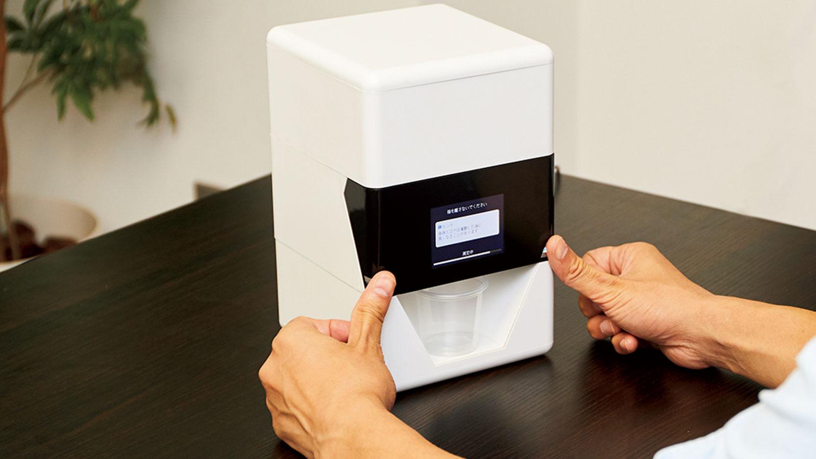 両手の親指で生体センサーにタッチすると、センサーが約20秒で脈に関するデータを取得。その情報を医師が監修した独自のアルゴリズムで解析し、精神・身体への負荷を数値化。サーバーから必要な栄養素が出される。