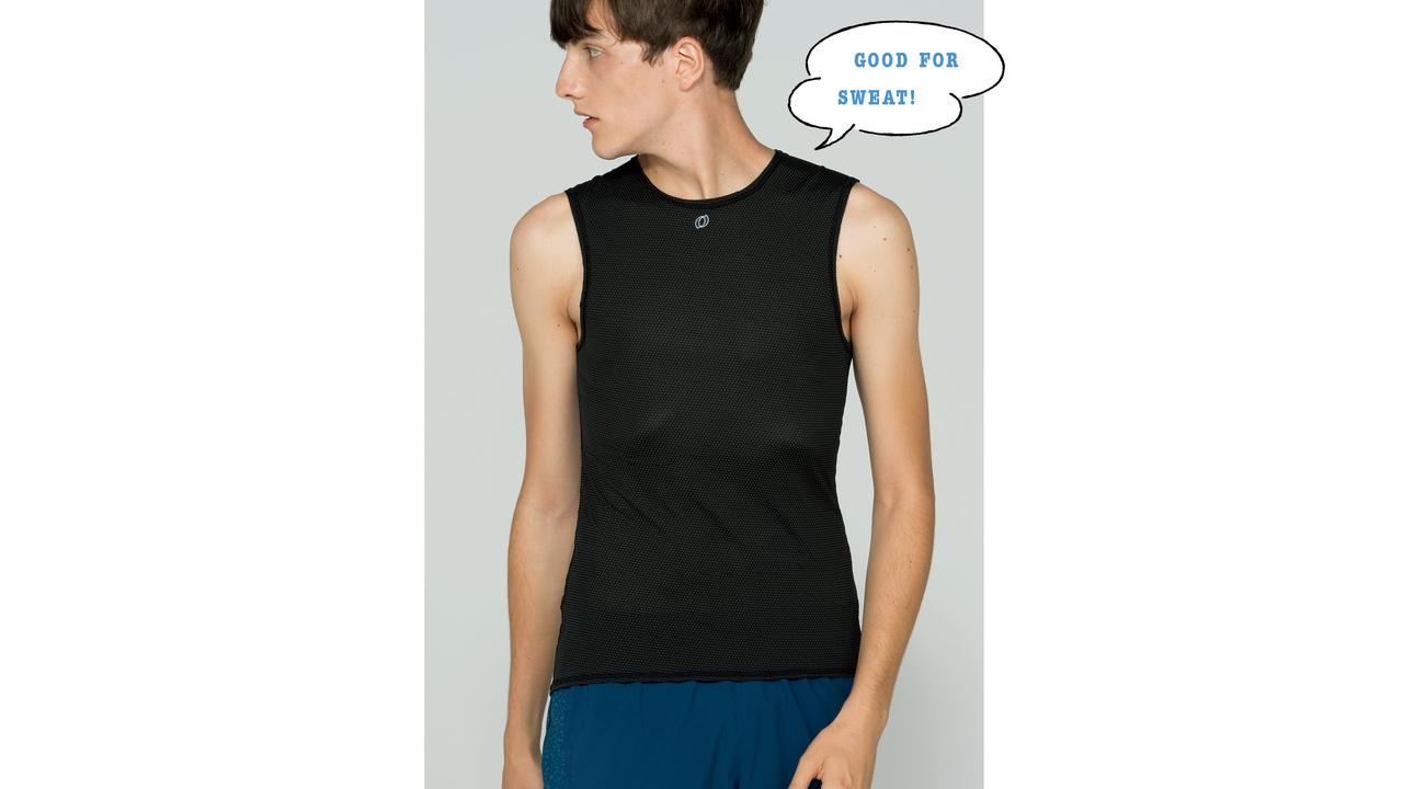 そこで、さらに快適性を求めるべく通常のシャツの下にもう一枚インナーウェアを着てみよう。これはアウトドアやエンデュランス競技などで重宝されているアイテム。ここではJapanマラソンクラブ代表の牧野仁さんイチオシのオンヨネのインナー《メンズブレステックPPノースリーブ》を例に、その利点を解き明かしていこう。