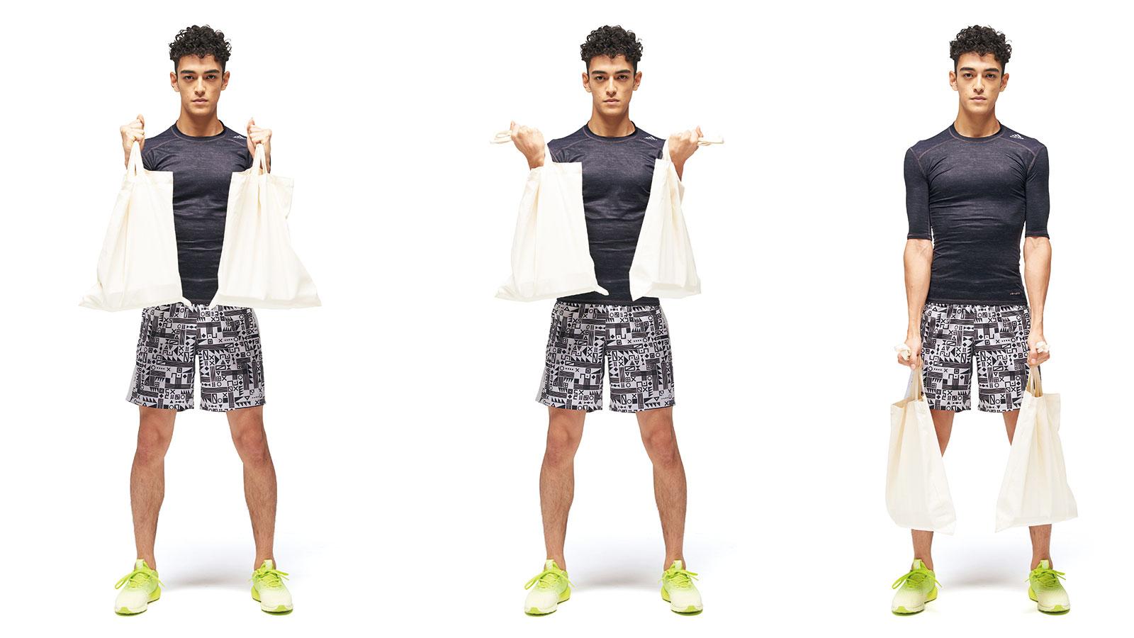 2Lのペットボトルを2本袋に入れる。これを2つ用意。袋の柄を短くして両手に持つ。まず、手首を外側に捻ってアームカール。3セット行ったら、親指を立てたハンマーカールを3セット。後者は深層の上腕筋に効く。