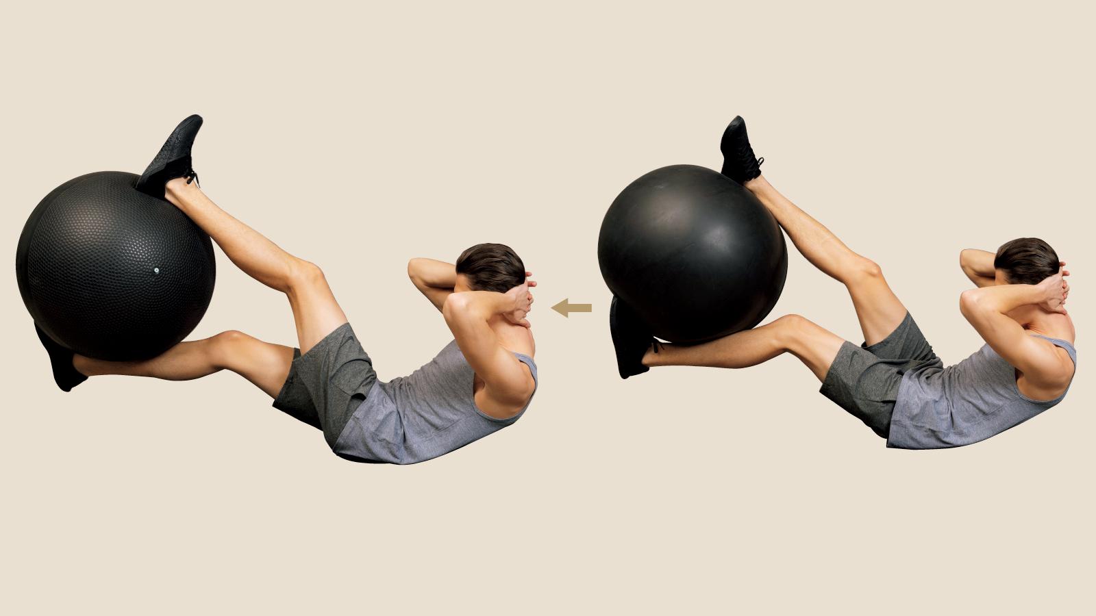 ボールのトップポジションに両足の踵を乗せて仰向けに。両手を頭の後ろに添え、両足を腰幅に開いて膝を90度曲げる。踵でボールを手前に転がしながら両膝を引き寄せつつ、膝と肘をつけるように上体を起こし、元に戻す。