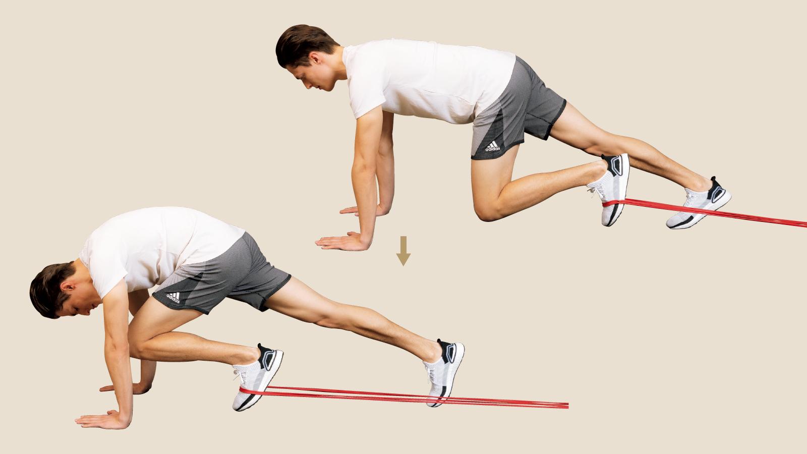 ベッドの脚などにチューブを回して、片端を片足の爪先に回してうつ伏せに。両手を肩の真下について腕立て伏せのスタート姿勢になり、頭から足首まで一直線に。