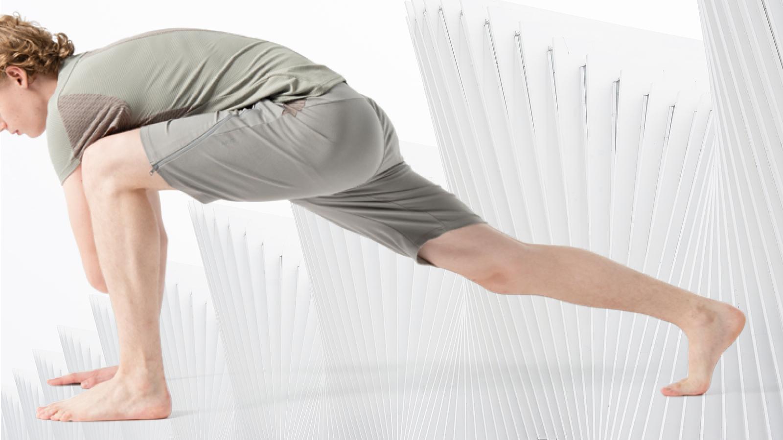 左足を前、右足を後ろにして大きく脚を開き、左膝を曲げて上体を前傾。右手は床につけ、左手を添える。このとき右脚の付け根が伸びる。次に右膝を床につけて左膝を伸ばして腰を後方に引く。左の太腿裏が伸びる。逆も。