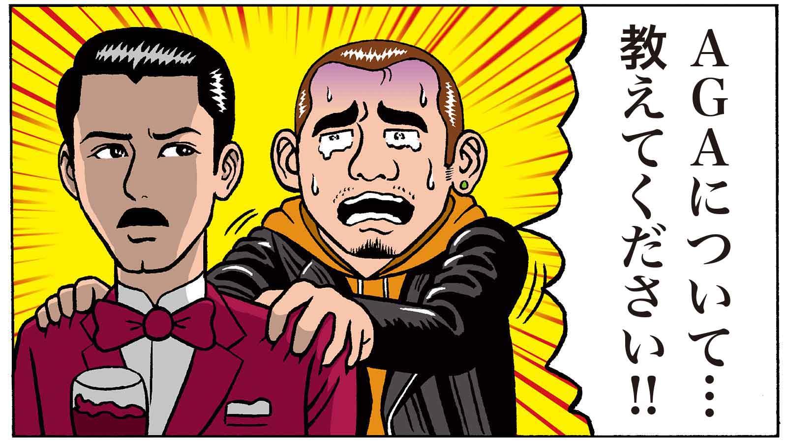 AGA先輩 ふむ…、心配するのも無理はない。それは男性型脱毛症といって、働き盛りのオトコに多い髪の毛の悩みだからね…。かくいう自分も20代後半で発症したのだが、クリニックに通い、いまはフサフサオールバックさ…。
