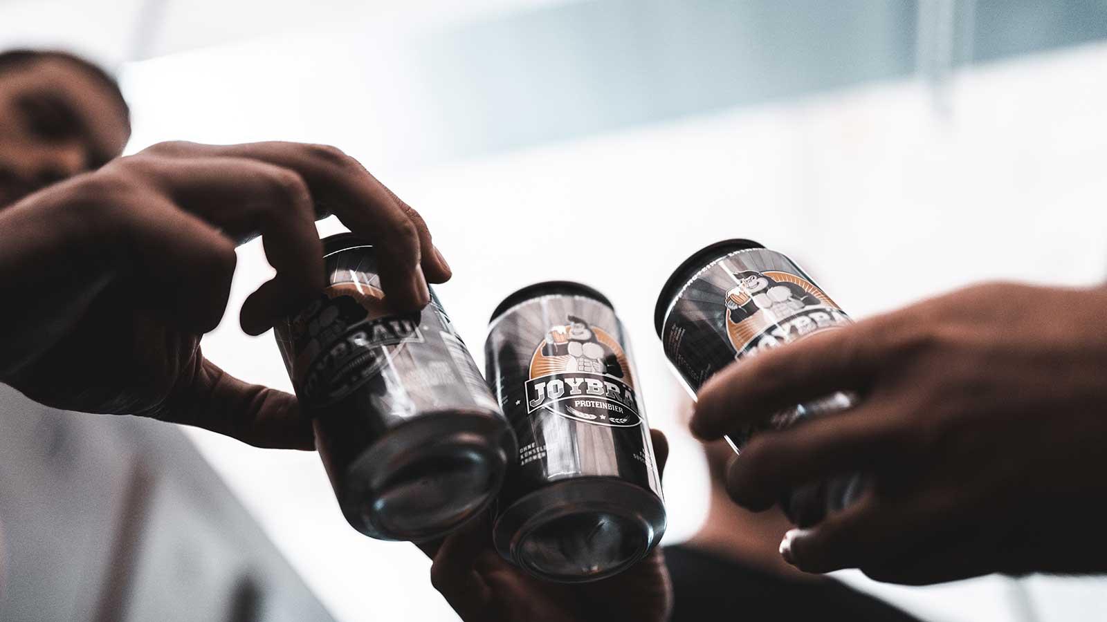 まず最初にビールにプロテインの粉を混ぜたところ“とてもマズい味”に。何軒かのビール工場に相談するも難航。転機は2年半前だ。ベルリン工科大学と共同研究を開始。その後創業150年以上のビール工場と手を組み、ノンアルコールの《ジョイブロイ》が誕生。