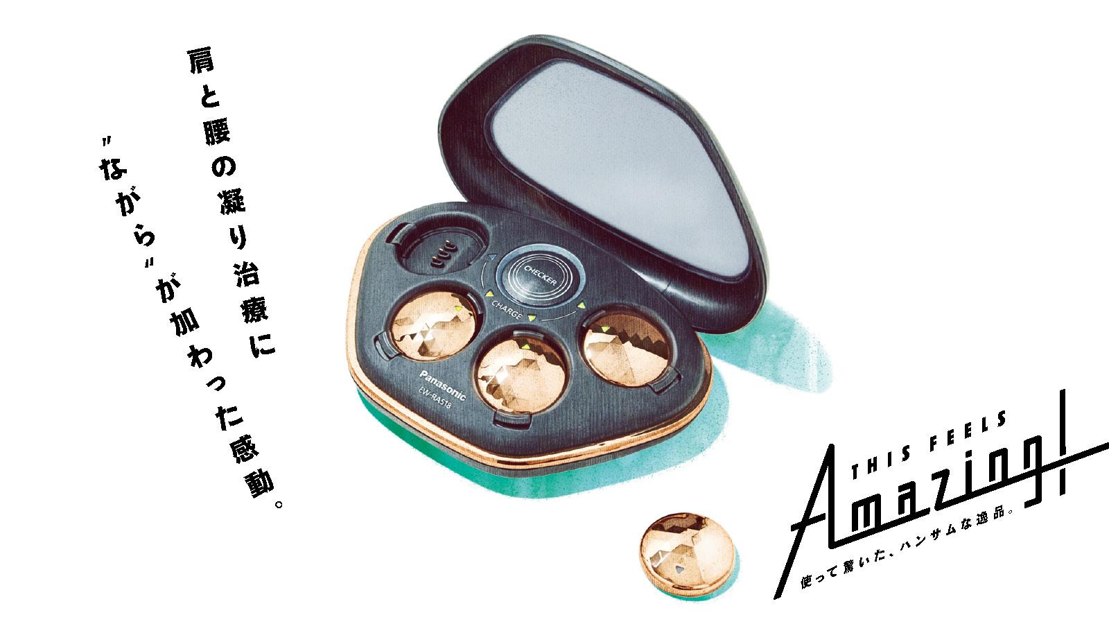 そこで試したのがパナソニックの高周波治療器《コリコラン》だ。高周波治療器と聞くと大仰そうだが、実物はご覧の通りのコンパクトサイズ。本体1個の直径は約3cm、重さは約6g。これをカラダの凝った部位に貼るだけでOKなのだ。肌になじむブロンズゴールドカラーで、襟元から見えても悪目立ちはしない。