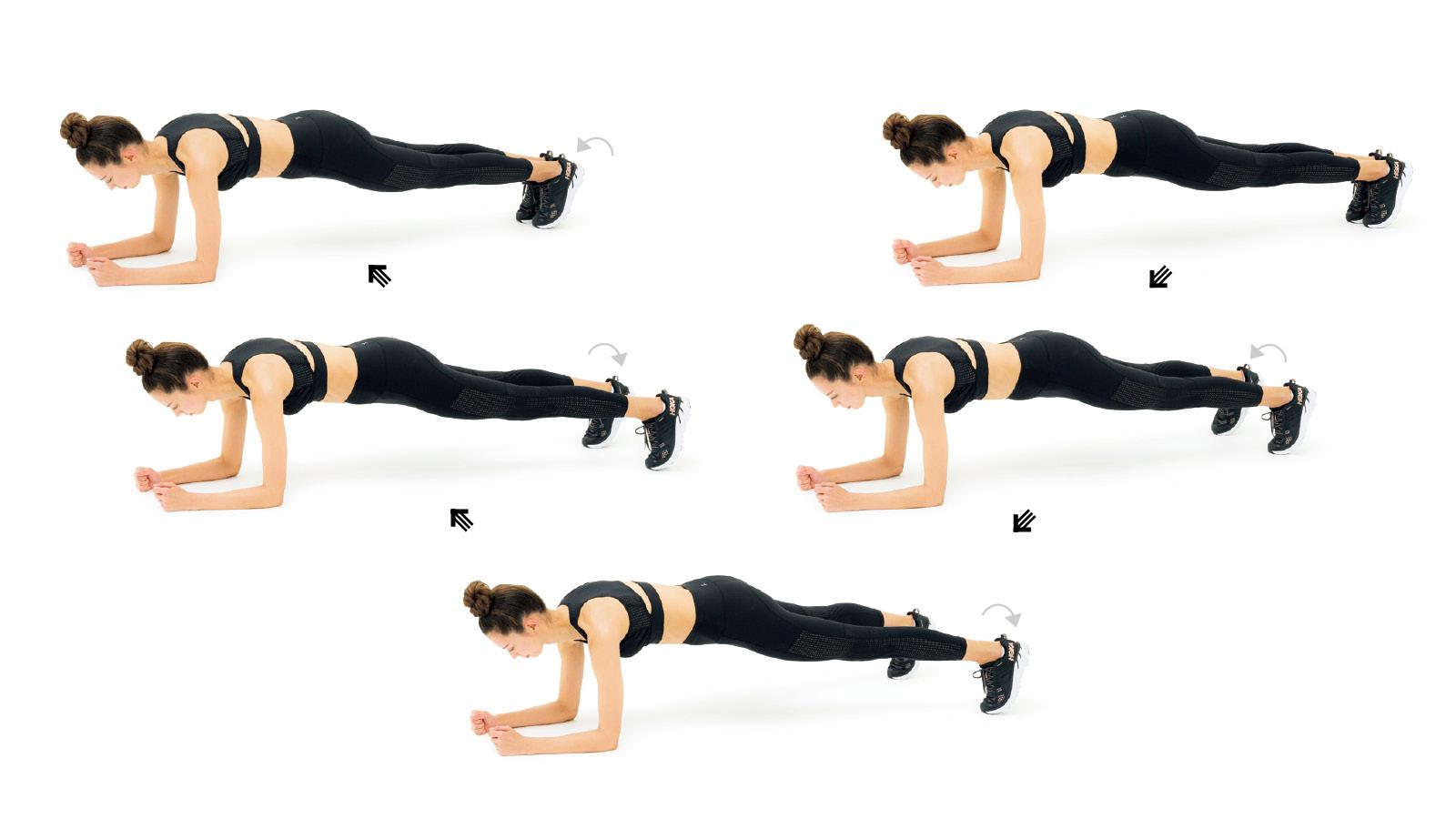 両足を腰幅に開いたベーシックプランクの姿勢をとる。まず左脚の膝を外側に出しながら肩に引きつける。元に戻って今度は右膝を外側に開いて肩に引きつける。これで1回。左右どちらかにカラダが開かないように。
