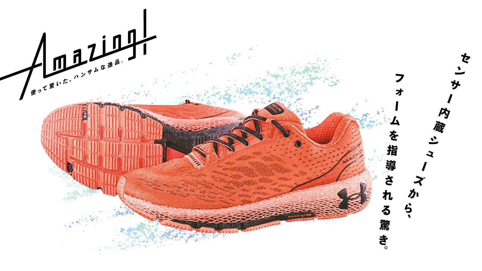 センサーチップが内蔵され、データを計測。専用アプリと接続するとフォームなどのアドバイスが受けられる。UNDER ARMOUR《UA HOVR MACHINA》15,000円。メンズ25.0~29.0cm、ウィメンズ22.5~26.0cm。重量約285g(27.0cm)、各3色展開。