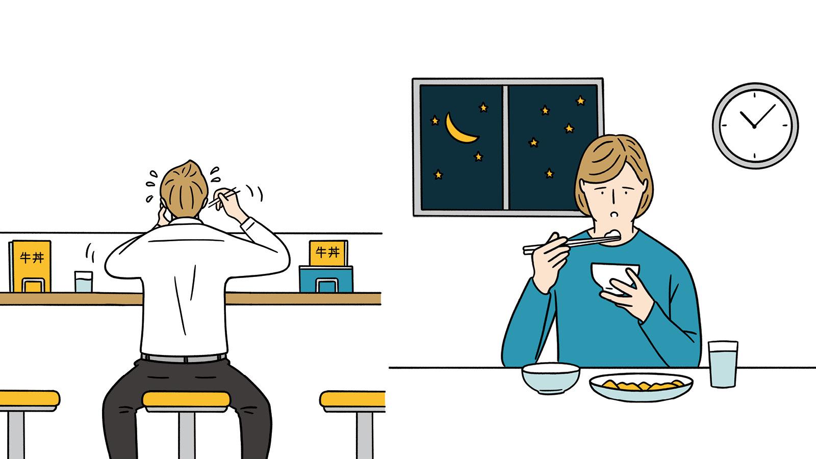- □ 昔から早食いで、よく嚙まないで飲み込むように食べる。