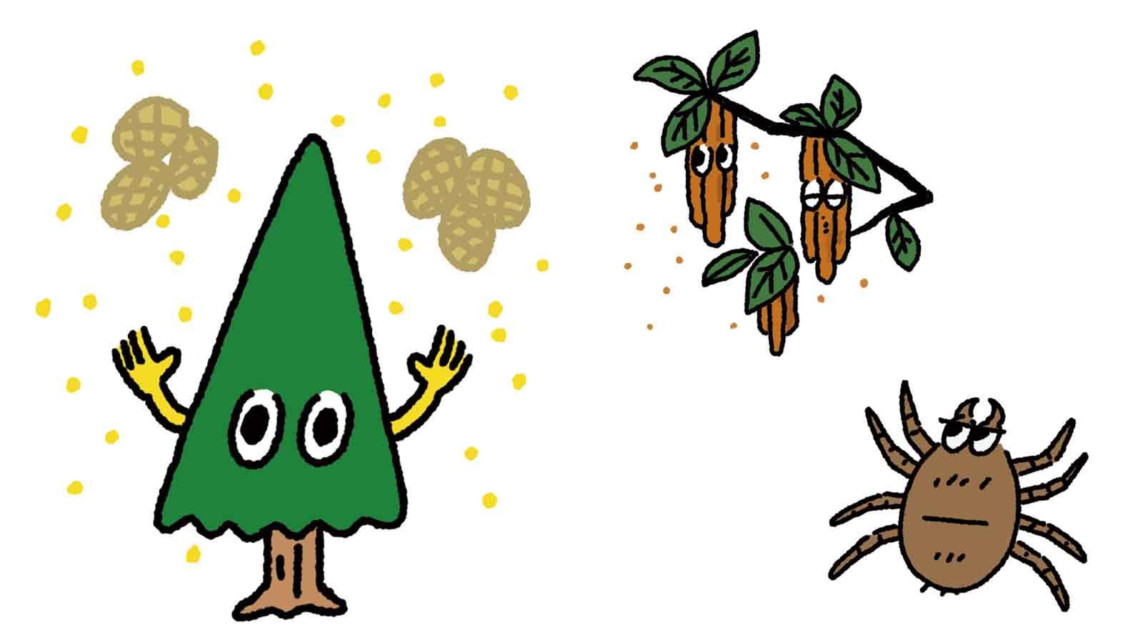 花粉症の場合、開花し、花粉が飛散する時期の近い植物がいくつもあると、どれが犯人か患者が自分で見極めるのは難しい。表の上から3つの樹木は時期が重なる。スギ花粉症だと思っていても、アレルギー検査結果はハンノキだったなどというのはよくある話。