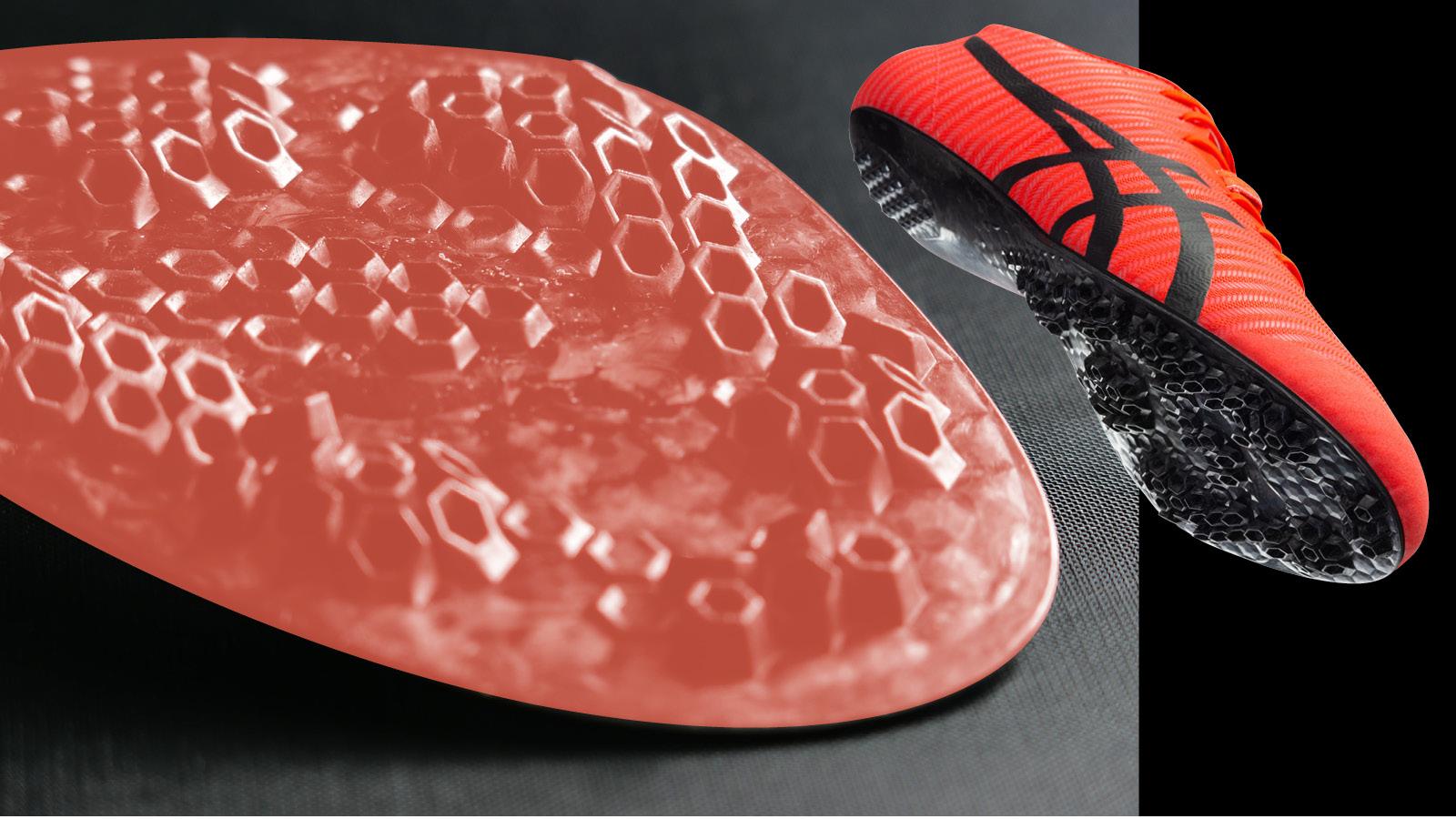 建築などで用いられる、形状の製作ルールを定式化するパラメトリックデザインという手法を採用。その結果生まれたハニカム構造の複雑な形を、特殊な成型技術で具現化。プレートも突起部分もカーボン素材でできたピンレスのソールが完成した。このカーボン繊維を用いた成型技術は、世界最大規模のカーボン材料の展示会で、部門賞を獲得し、世界中の視線を集めている。