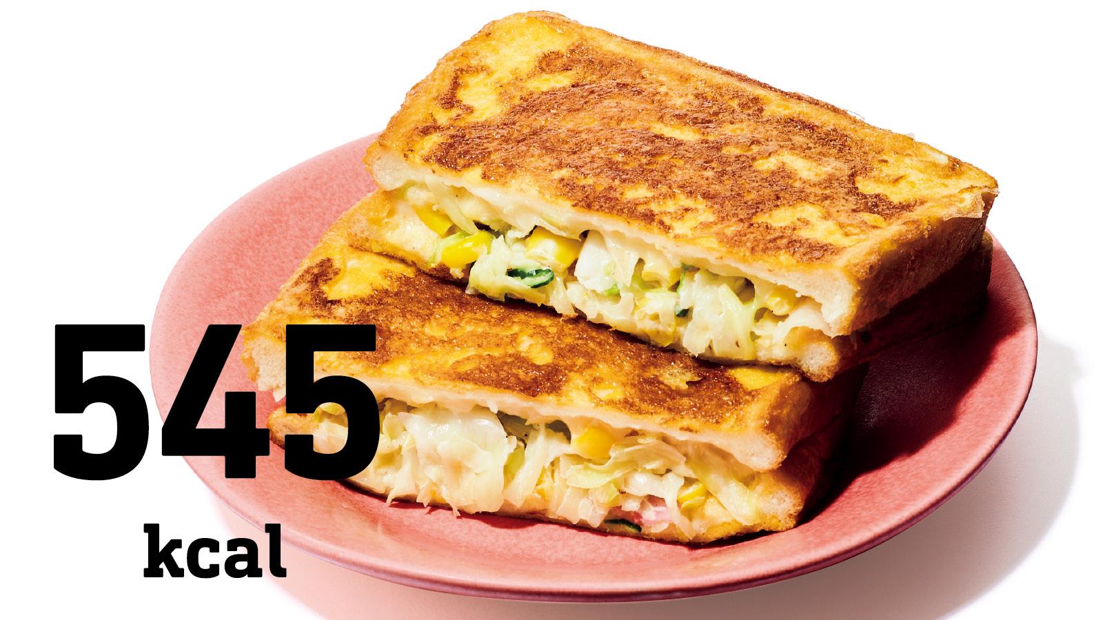 モンテクリストサンドとは、具材を挟んだパンを卵液に絡めて焼いた北米生まれのサンドイッチ。キャベツのビタミンC、ハムとトウモロコシのビタミンB1を一度に摂れるコールスローをサンドして、卵とチーズでタンパク質をプラス。
