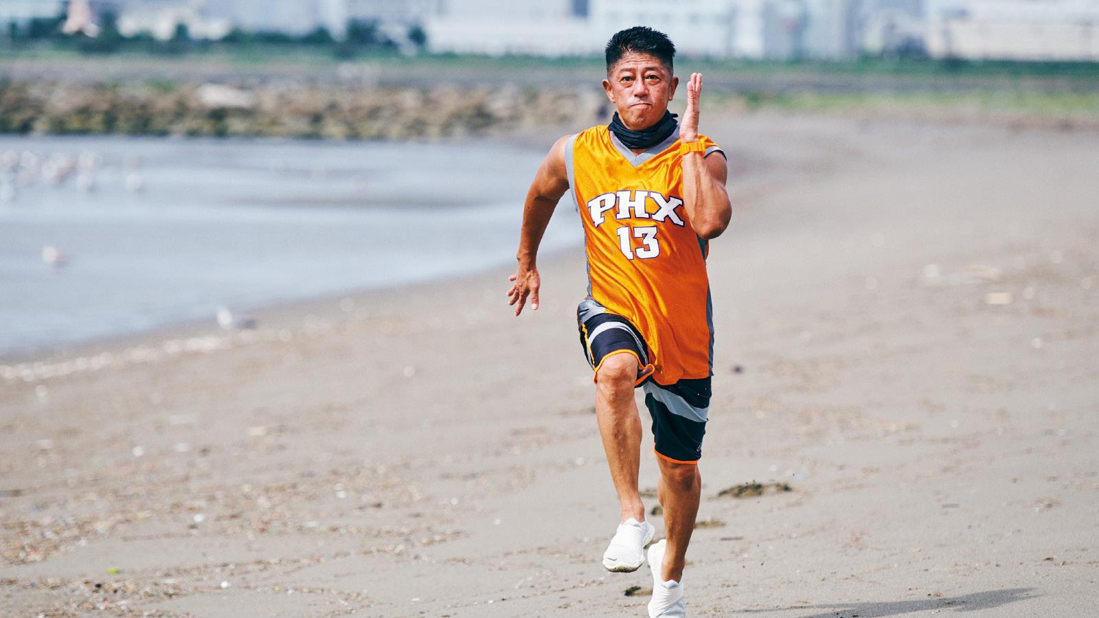 自宅付近の海までゆっくり走り、浜辺に着いたらダッシュ開始。20〜30秒全力で走り、スタート位置までジョグで戻る。これを10本。ビーチが家族連れで賑わっている時は、近所の野球場前で行う階段ダッシュに切り替えることもある。