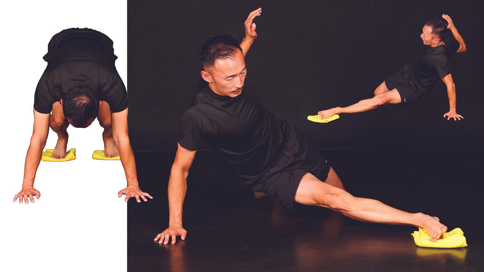 使うのは雑巾2枚。これを用いて手足で床や壁を押さえ、滑らせることでターゲットとなる筋肉を多方向に動かし、鍛えられるメリットが。