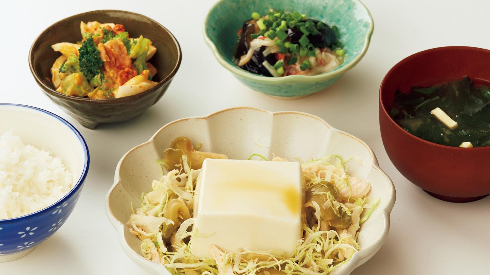 豆腐、チキン、かにかま、卵と、タンパク質を植物性と動物性からバランスよく補給できるメニュー。即席味噌汁に追加したフリーズドライの野菜は、カットの必要がなくそのまま使えるうえに、食物繊維が手軽にたっぷり摂れるので便利。