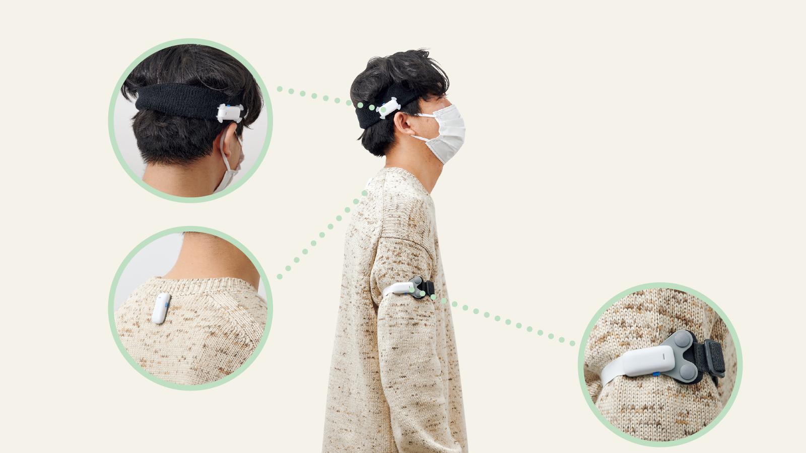 装着ストラップに付けた筋骨格センサーを上腕二頭筋、モーションセンサーを耳上と首下に。立位で両腕を水平に上げた状態で保ち肩の上昇具合、座位と立位のまま保ち体軸のズレ具合を定量化。