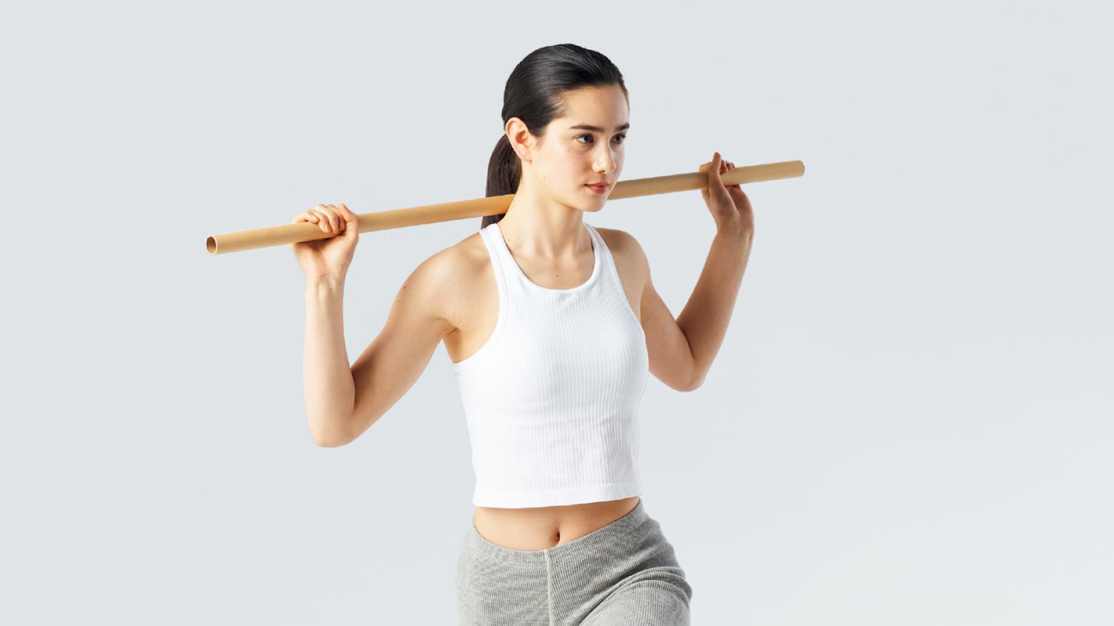 - 両手でバー(または傘)を肩幅より広めに持ち、両腕を耳の真横でまっすぐ伸ばす。