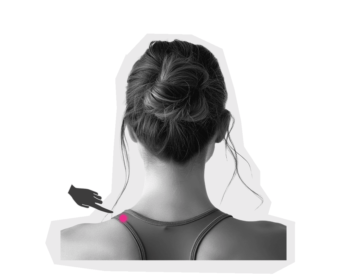 第7頸椎(頭を前方に倒すと出てくる骨)と、肩峰を結んだ線の中央にある。乳頭から真上に進み、第7頸椎と肩峰を結ぶ線と交差する場所だ。