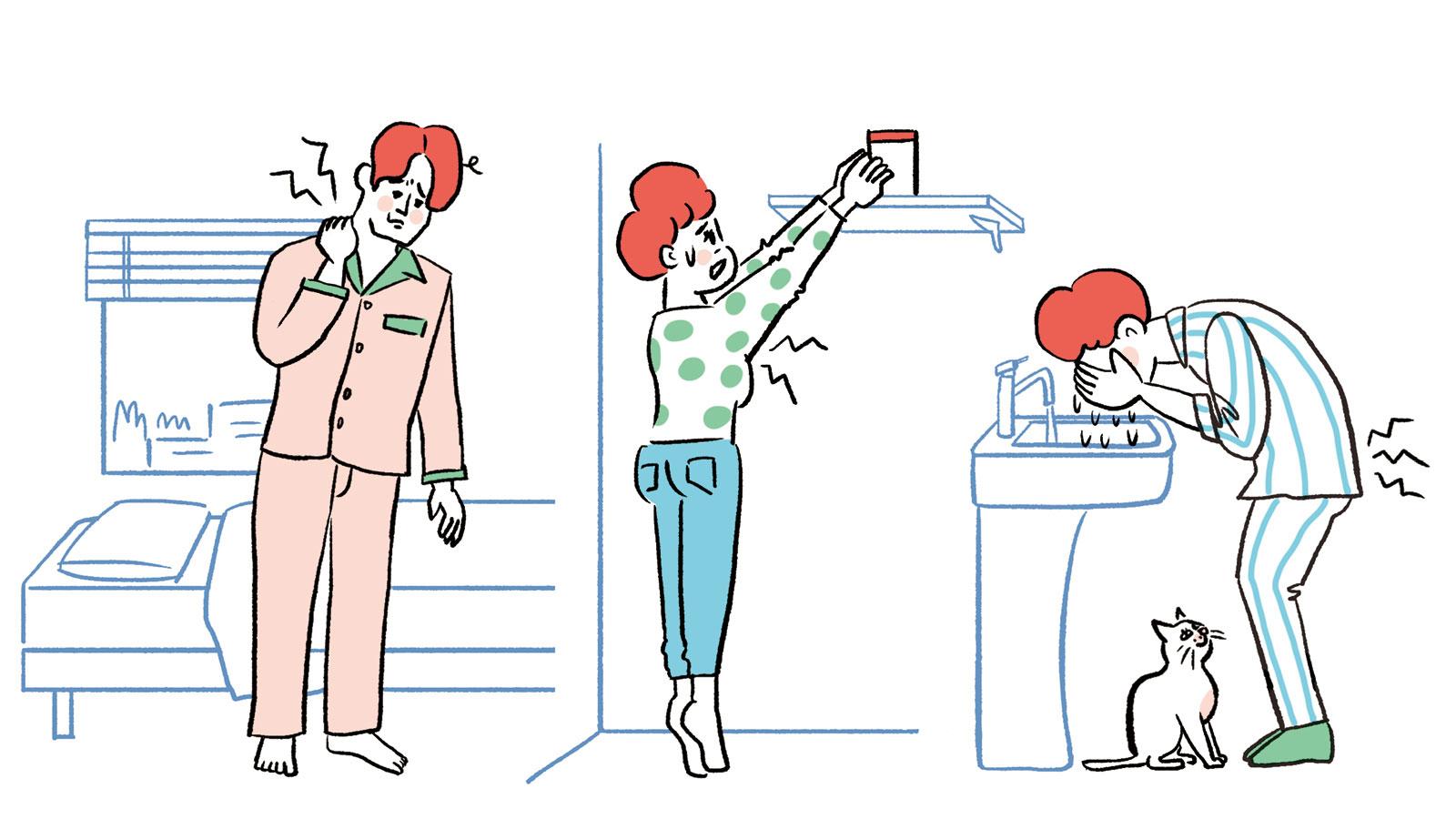 寝違えをすることがとても多くて困っています。午前中は人に呼ばれても即座に振り向くことができません。首が片側に傾いて反対側の視野が欠けるので、歩き方も「欽ちゃん走り」のようなおもしろいフォームになってしまいます。朝起きて寝違えていたとき、何かできることはあるでしょうか?