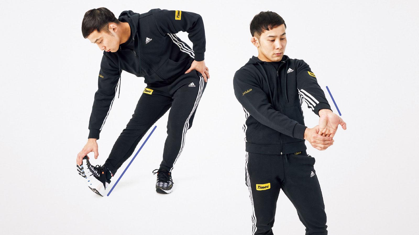 前腕と手の指、脚の裏側と足裏および足指を伸ばすストレッチ。試合の直前、畳の上でやることが多い。冷えやすく、攣りやすいカラダの末端を伸ばしながら細かく動かしてケアをする。指先までベストな状態にして試合に臨む。
