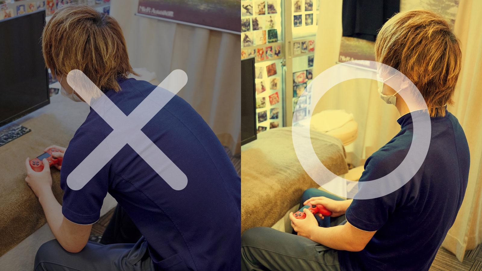 特にオンラインゲームの場合、数時間やり続けるので、上のように前屈みの姿勢だとあっという間に肩甲骨まわりが凝り固まってしまう。熱中するのはいいが、なるべく上(写真)のようにのんびりテレビを見るようなイメージで、背もたれに上半身を預けるような姿勢で行おう。
