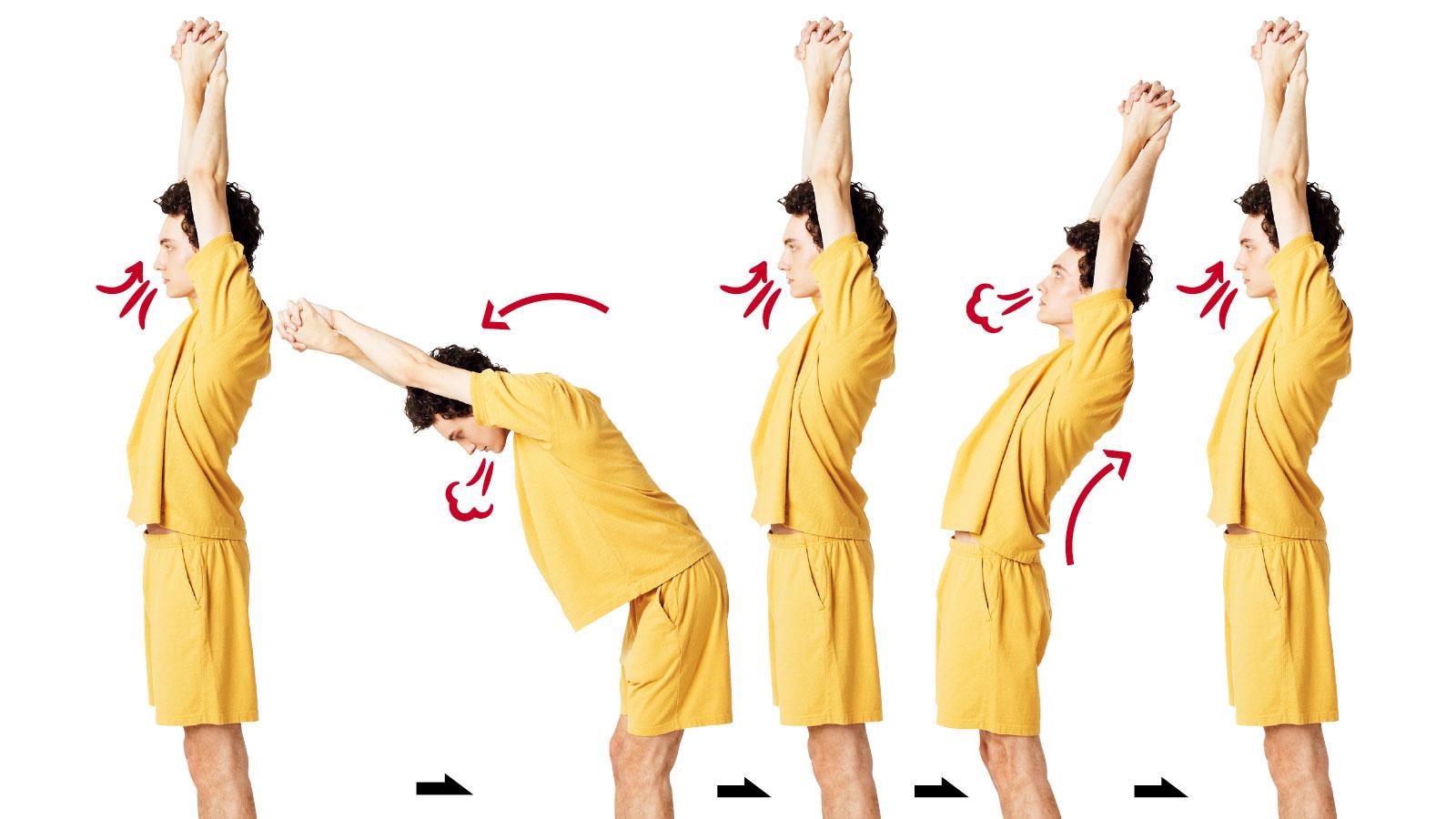 鼻からゆっくり息を吸いながら、さらに腕を天井へ伸ばす。口から息を吐きながら、上体をゆっくり前に倒し、鼻から息を吸いながら元に戻る。同様に上体をゆっくり後ろに倒す。