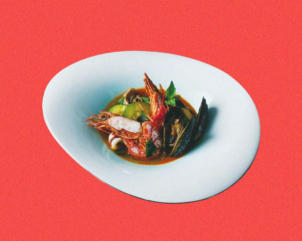 “イタリアの寄せ鍋”をイメージしたポトフは、「魚介の具材はほかに何を使ってもおいしい。フレッシュな酸味も欲しいので、トマトは生を使うのがおすすめです」。