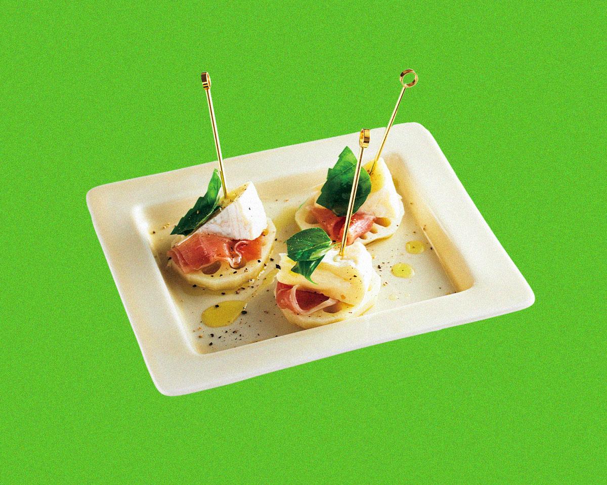- レンコン、生ハム、カマンベールチーズの順で重ねて串を刺し、バジルをちぎって乗せる。器に盛り、オリーブオイル(分量外)をかけ、粗挽き黒胡椒を振る。