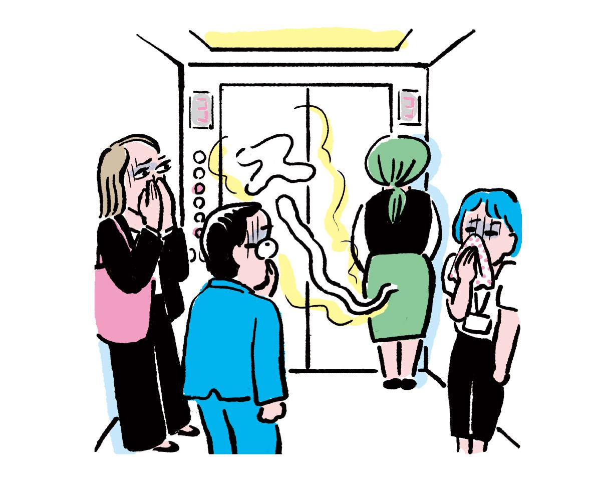 「腸内には約1000種、100兆個の細菌が棲息し、消化分解の過程で硫化水素を産生するものは結構多い。それゆえ、ガスそのものを無臭にするのは至難のワザです。ただ、空気中に舞う濃度が薄まれば、話は変わってきます。飛行機に乗るとおならよく出ませんか? これは、気圧が低下する影響で、体内のガスが膨張するからです。でも、不思議とニオわない。なぜなら、下着やシートがニオイを吸着するので。遮るものを増やすと、表に出たガスの濃度を下げられます。日常では消臭効果のあるセラミックパウダーを繊維に練り込んだようなショーツを穿くのも、一つの手です。逆に遮蔽物がないので、裸でするおならが最も臭いといえましょう。ただ、浴槽内でするおならは臭わない。硫化水素は水溶性のため、湯船の中でするとニオイが消えてしまうんですよ」