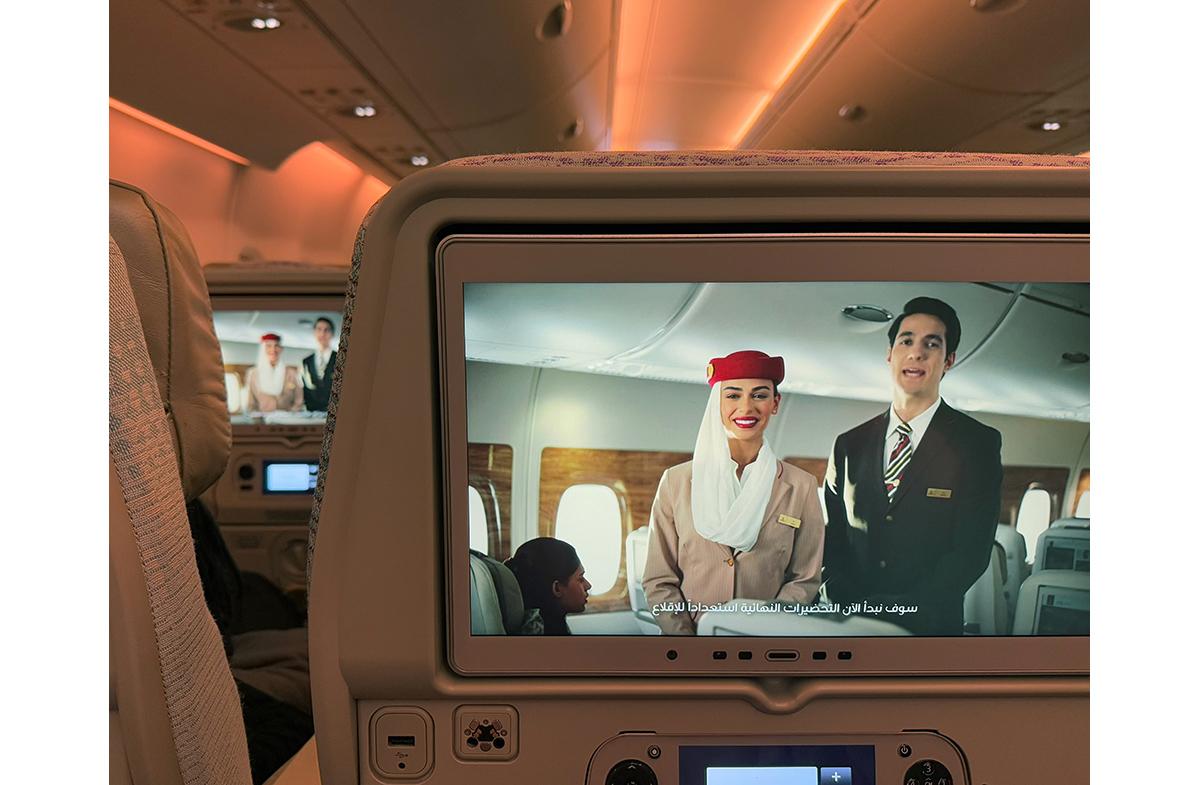 現地への足はUAEの〈エミレーツ航空〉で。緊急時のための機内アナウンス映像を見ていると、気分はすでに彼の地へ。