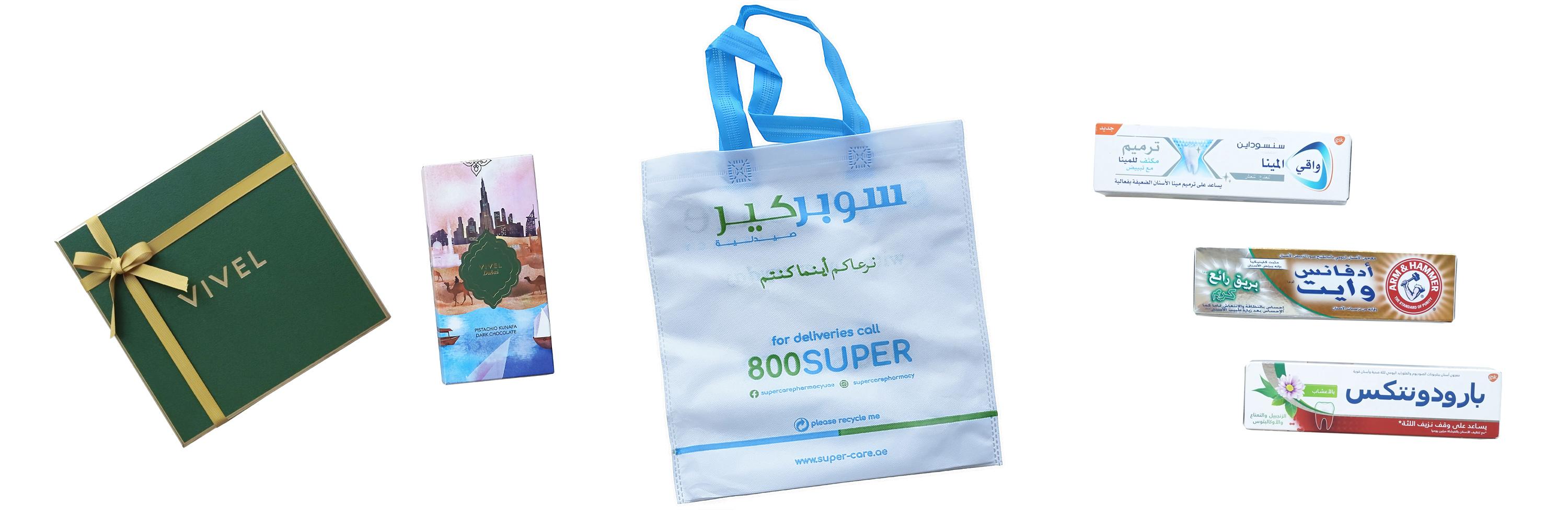〈VIVEL〉のドバイチョコをお土産用に。チェーン店のドラッグストアで適当な歯磨き粉を自分用に購入。ショッパーが可愛い。