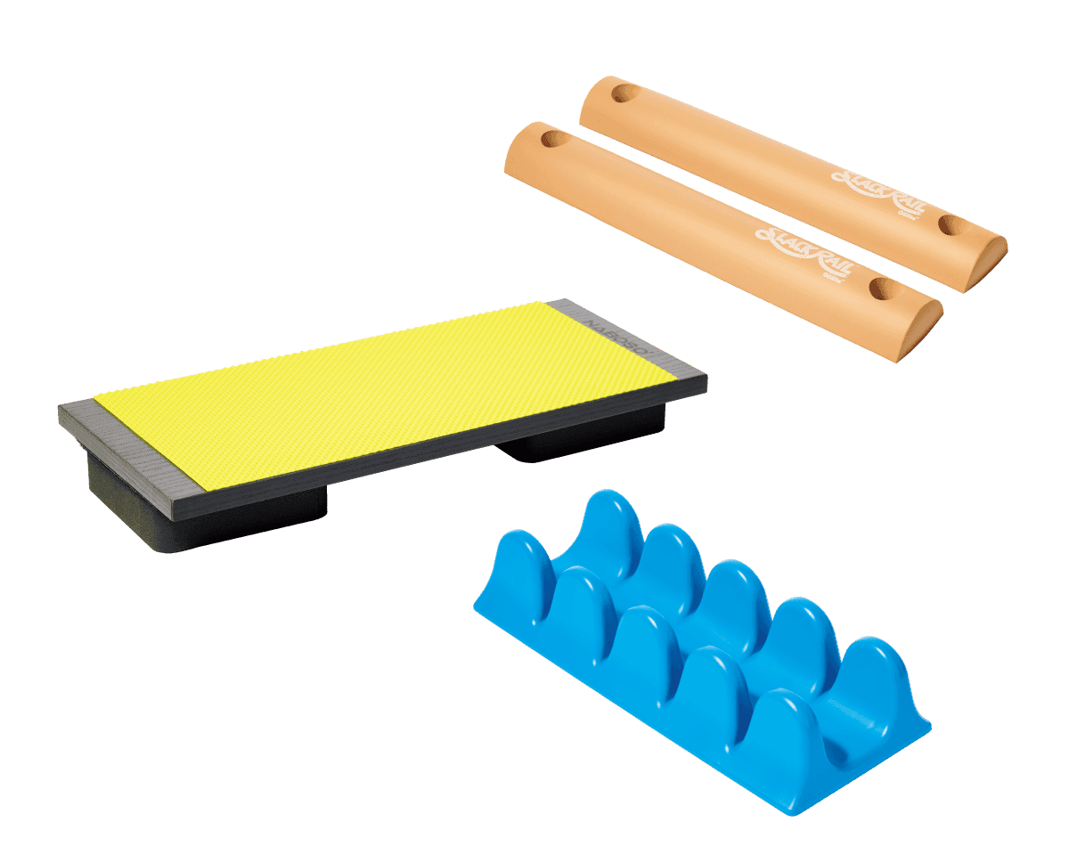 ボード上に片足で立つと、微細な揺れと、ナボソ独自のテクスチャーが、足関節や筋肉、足裏を刺激。バランス能力が向上し、足の状態も整う。左右差の発見にも繫がる。14,300円。