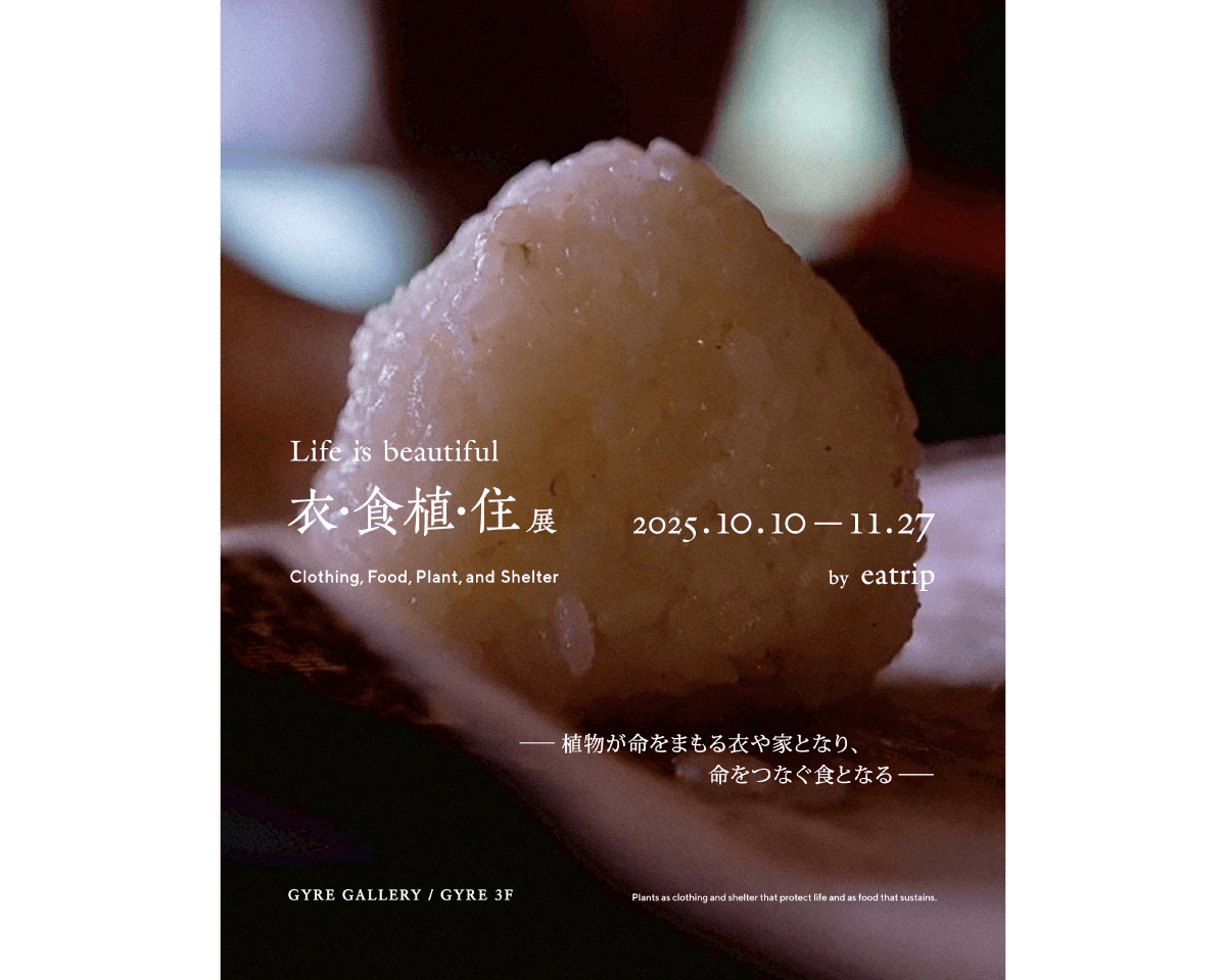 表参道〈GYRE〉で開催中の『Life is beautiful : 衣・食植・住』展。前回の『住』展に続き、今回は食をテーマに、「米」という日本の暮らしに欠かせない存在を見つめ直す。企画を手がけるのは、料理人の野村友里。人と自然、過去と未来をつなぐ象徴としての米を、写真、インスタレーション、言葉を通して多角的に表現する。会場では、米の歴史にまつわる貴重な資料の展示や、田んぼの音を体感できる空間演出のほか、文化や食に関わる人々が語る「あなたにとって米とは?」の言葉も紹介。そのどれもが、米や、それを育む自然そのものが、私たちの生き方や記憶に密接に根付いているということを思い出させてくれる。便利さやスピードばかりが優先される今だからこそ、食べるという行為をあらためて考えてみたい。