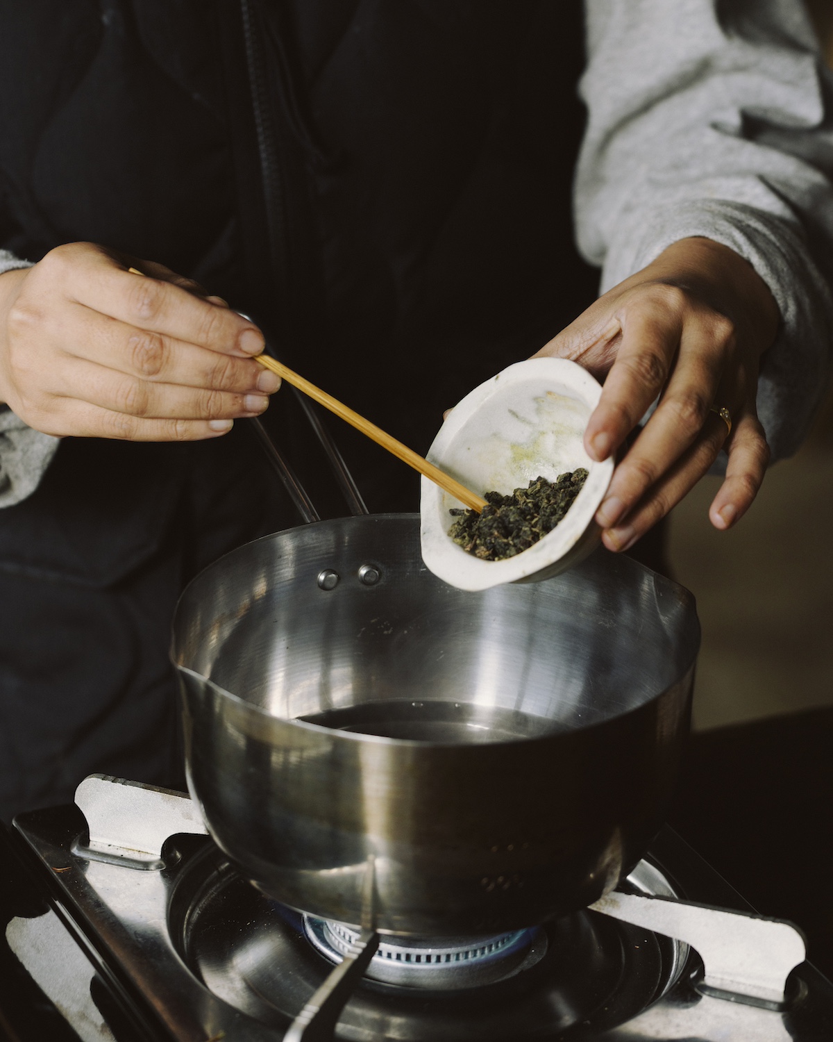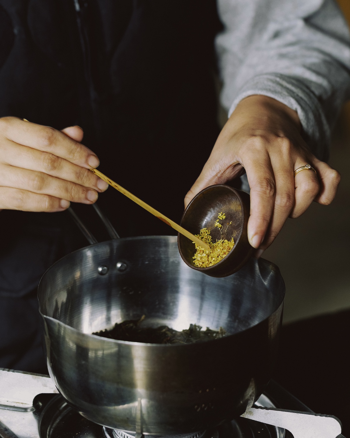 主役級の華やかさもありますが、ほんの少し香りを纏わせるようなイメージで使うと、他のお茶を引き立ててくれます。特に僕が好きなのは、クロモジと金木犀の組み合わせです。まとめ役としても有能で、金木犀を合わせれば大抵のお茶は美味しくできてしまう。むしろ使いすぎないようにセーブをしているくらい万能な植物なんです。