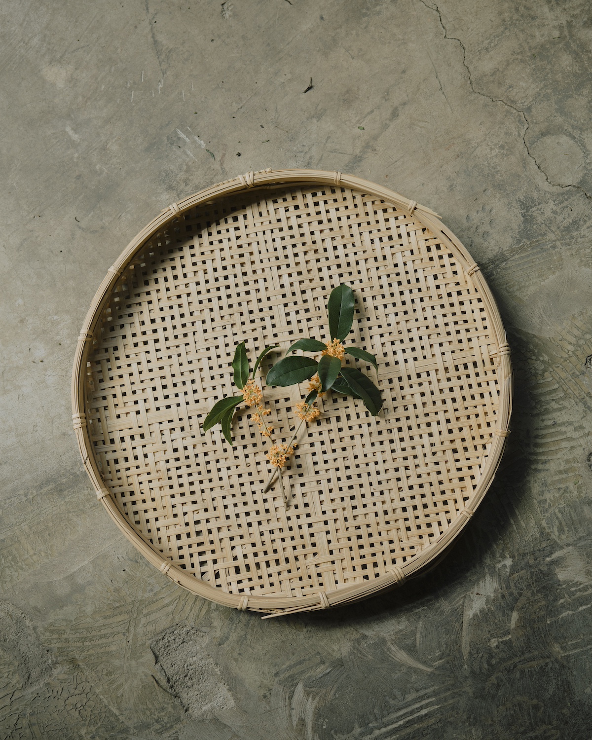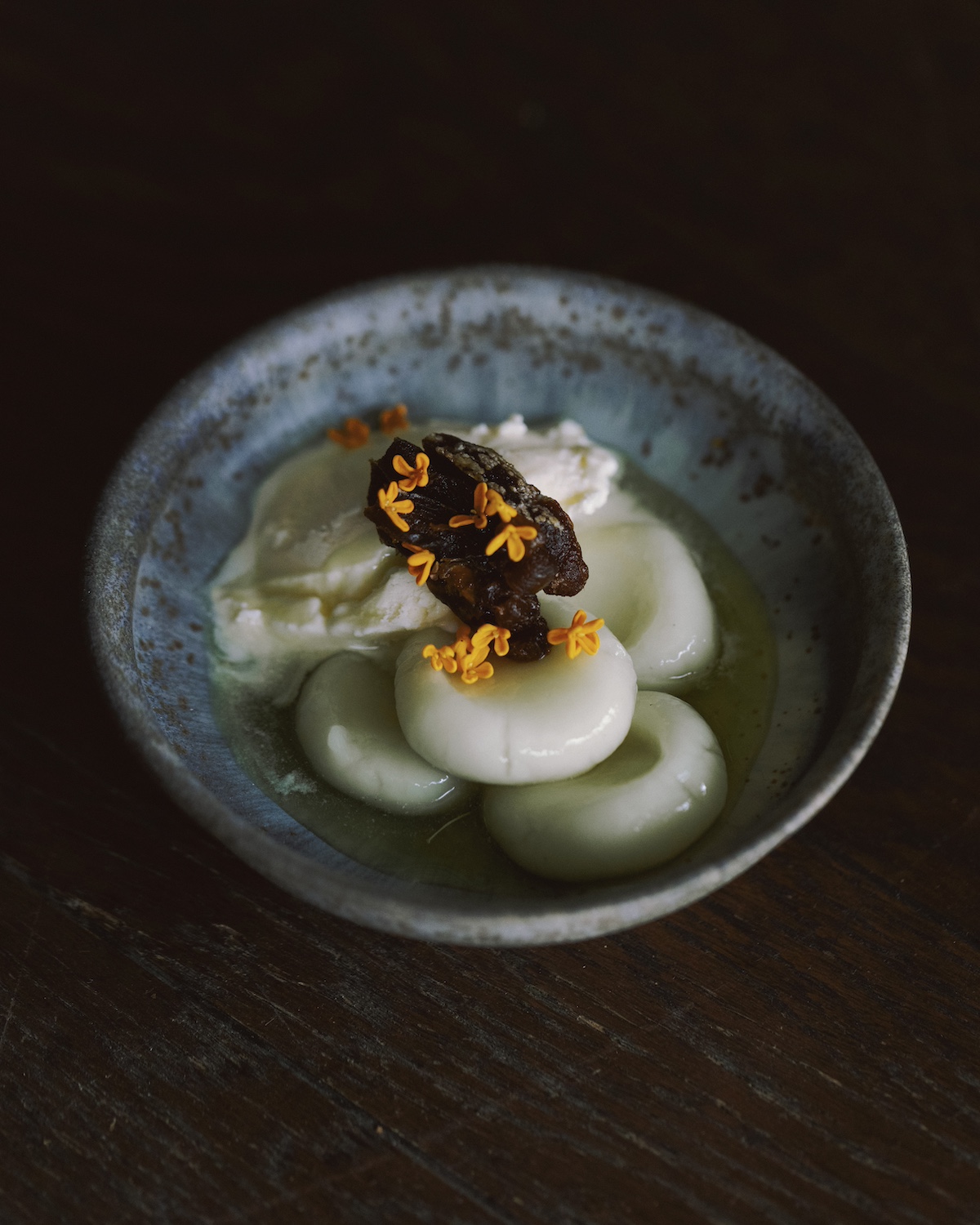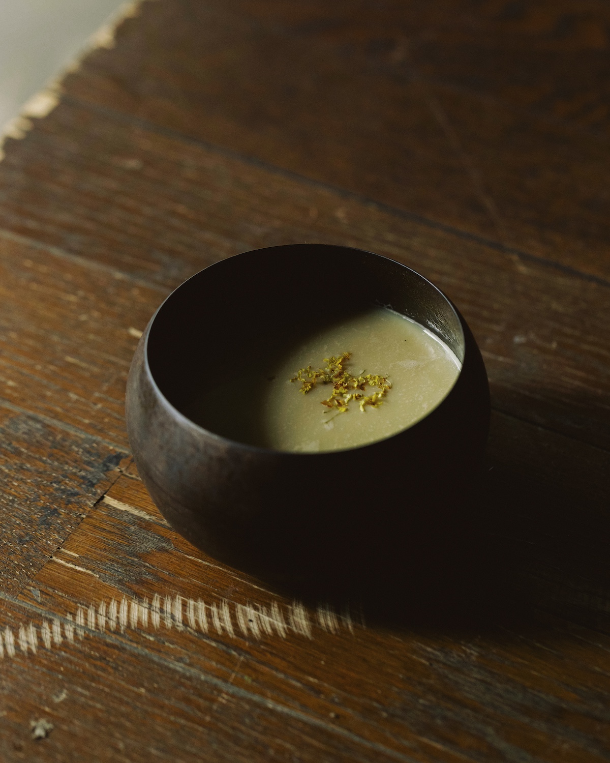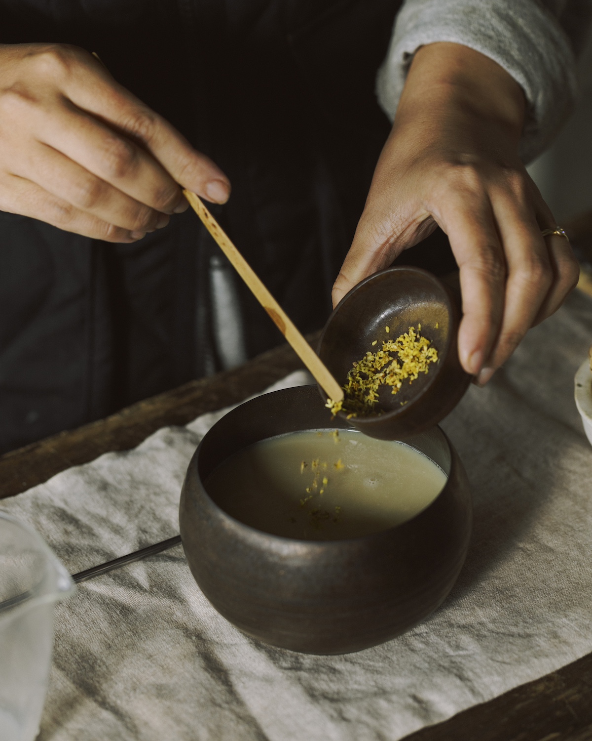 金木犀のお茶を出汁のように使って白玉を作り、同じく金木犀を使ったシロップと合わせました。台湾には桂花茶と同じように、桂花陳酒という金木犀のお酒があります。食用としての文化が深いことがわかるのですが、調べてみると台湾と日本の金木犀は、少し品種が違うそう。日本の金木犀できちんと乾花を作ったら、より香りが高いかもしれません。今回は、フレッシュの金木犀も入れています。ぜひ花を収穫して、食用として使ってみてください。