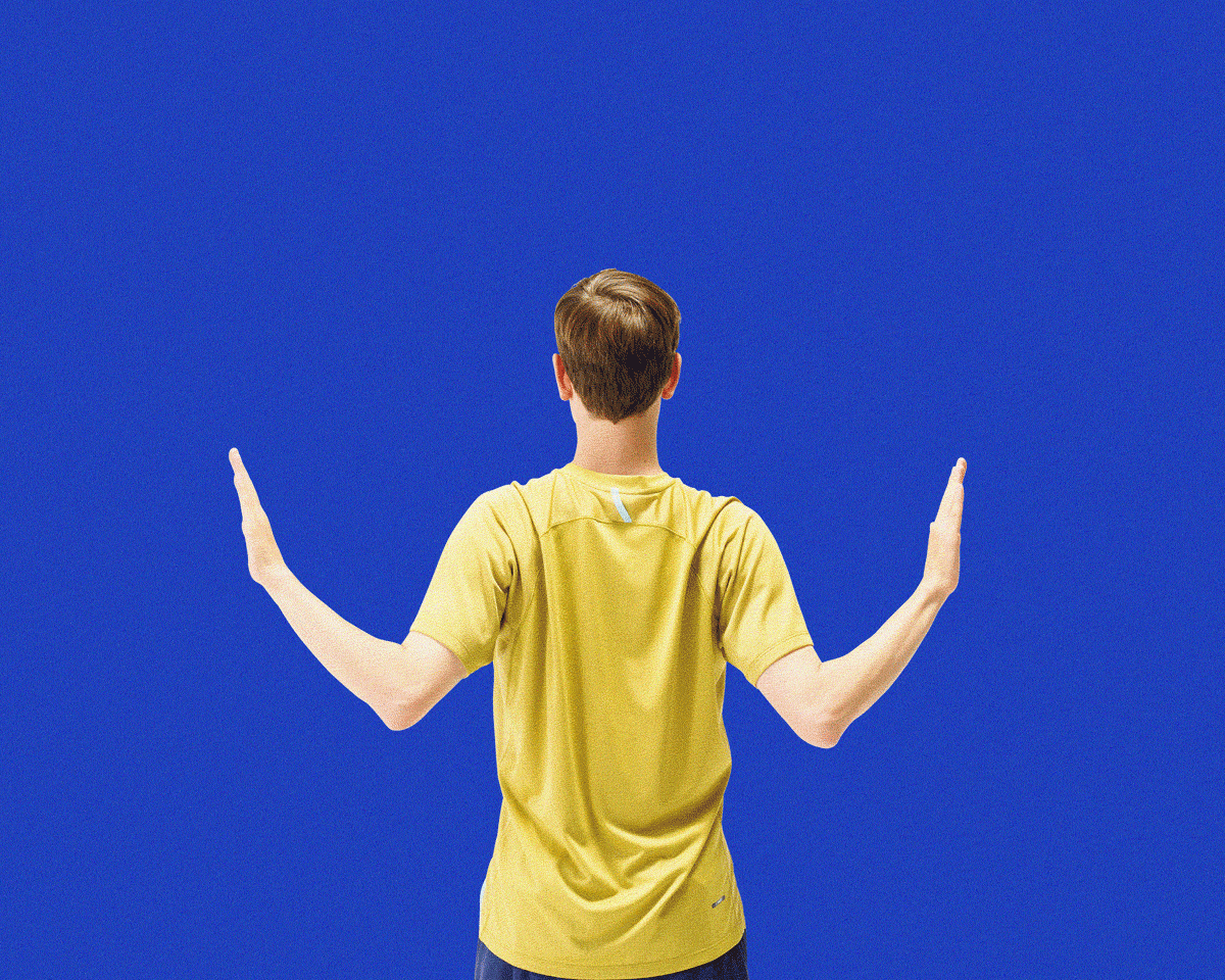 - 両手を斜め上に伸ばして「Y」の字を描き、肩甲骨を引き寄せる。腕を持ち上げるのではなく、肩甲骨の動きに従って腕が持ち上げられるイメージ。20回繰り返し。