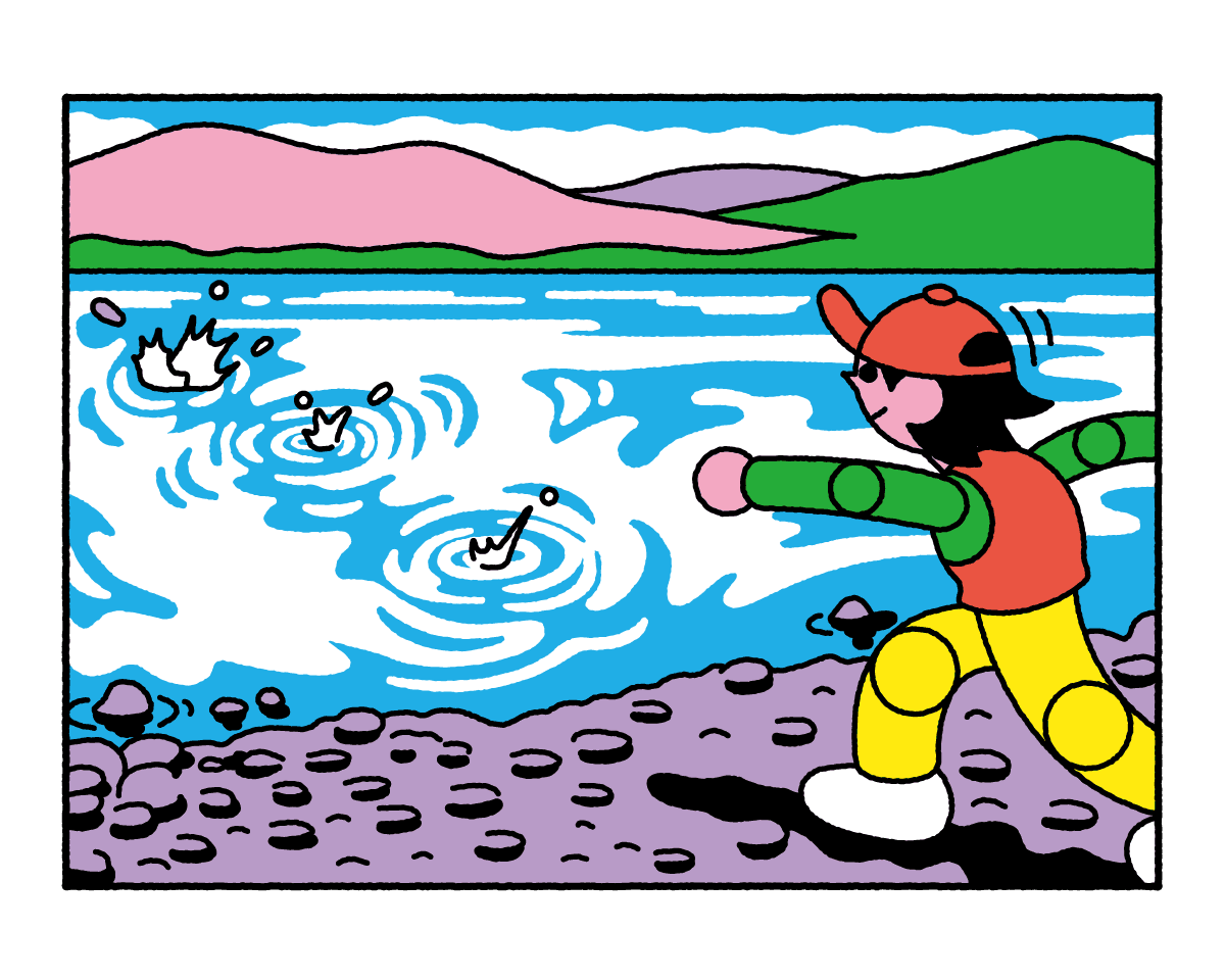 水辺に行ったら、やっぱりコレ。美しい波紋を量産する鍵は、肩のローテーターカフと安定した体幹にある。力まず、しなやかなスナップを利かせるのがコツだ。石を操る手の内在筋の繊細な感覚も研ぎ澄まされる。