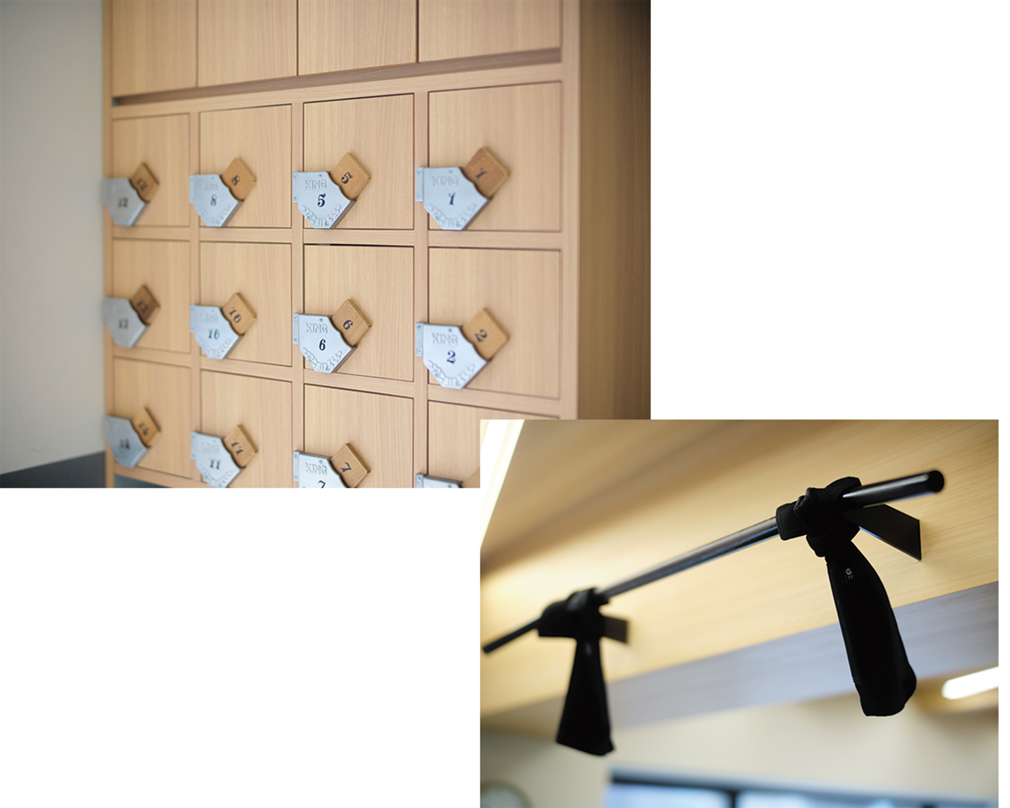 道場の一角には、ストレッチポール的な機器も。靴箱には和の趣が感じられる。