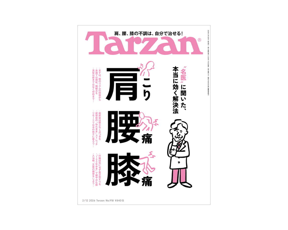 『Tarzan』918号(2026年1月22日発売)の特集は「“名医”に聞いた、本当に効く解決法 肩こり 腰痛 膝痛」肩、腰、膝の不調は、自分で治せる! エキスパートに徹底取材した、三大痛み解消のセルフケア決定版。