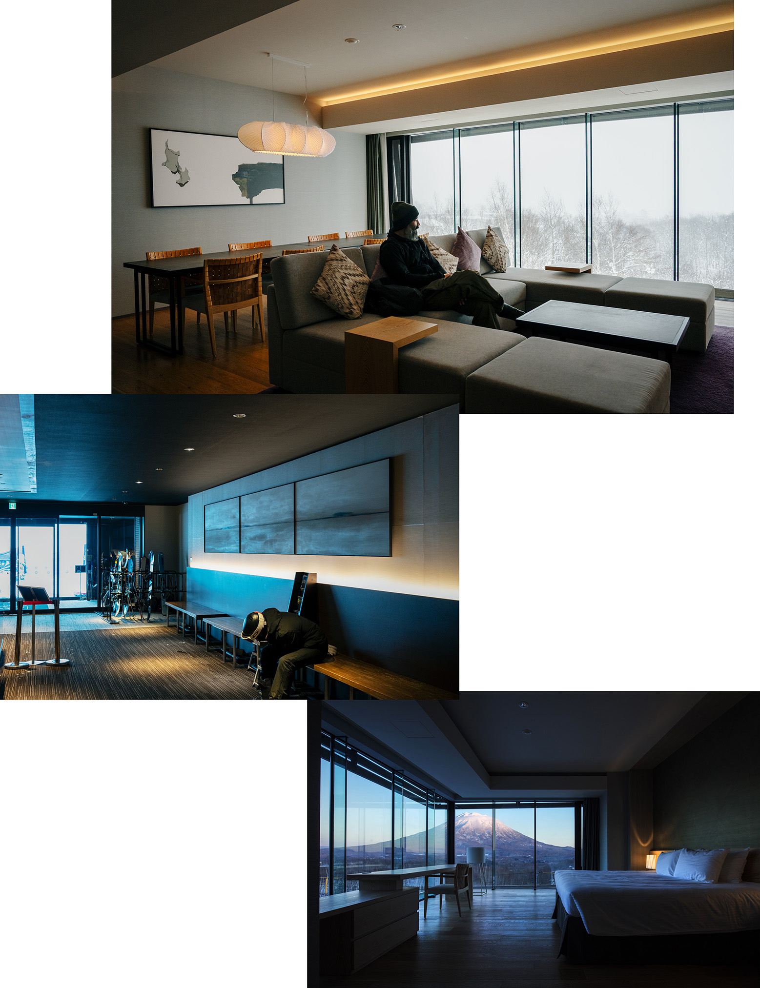 〈ニセコ東急グラン・ヒラフ〉に直結したラグジュアリー・コンドミニアム。夏場には部屋から羊蹄山を正面に見据え、冬場には雪が降る様子を暖かい部屋から堪能できる。写真は、3ベッドルーム。定員6名、最大7名まで宿泊できるため、友人や家族との長期ステイにも。キッチンも完備している。 壁に飾られた絵画は、北海道ゆかりの彫刻家である、国松希根太によるもの。