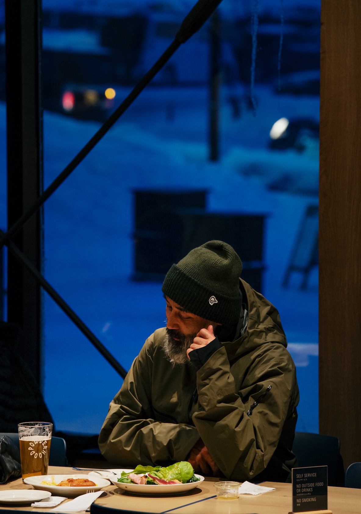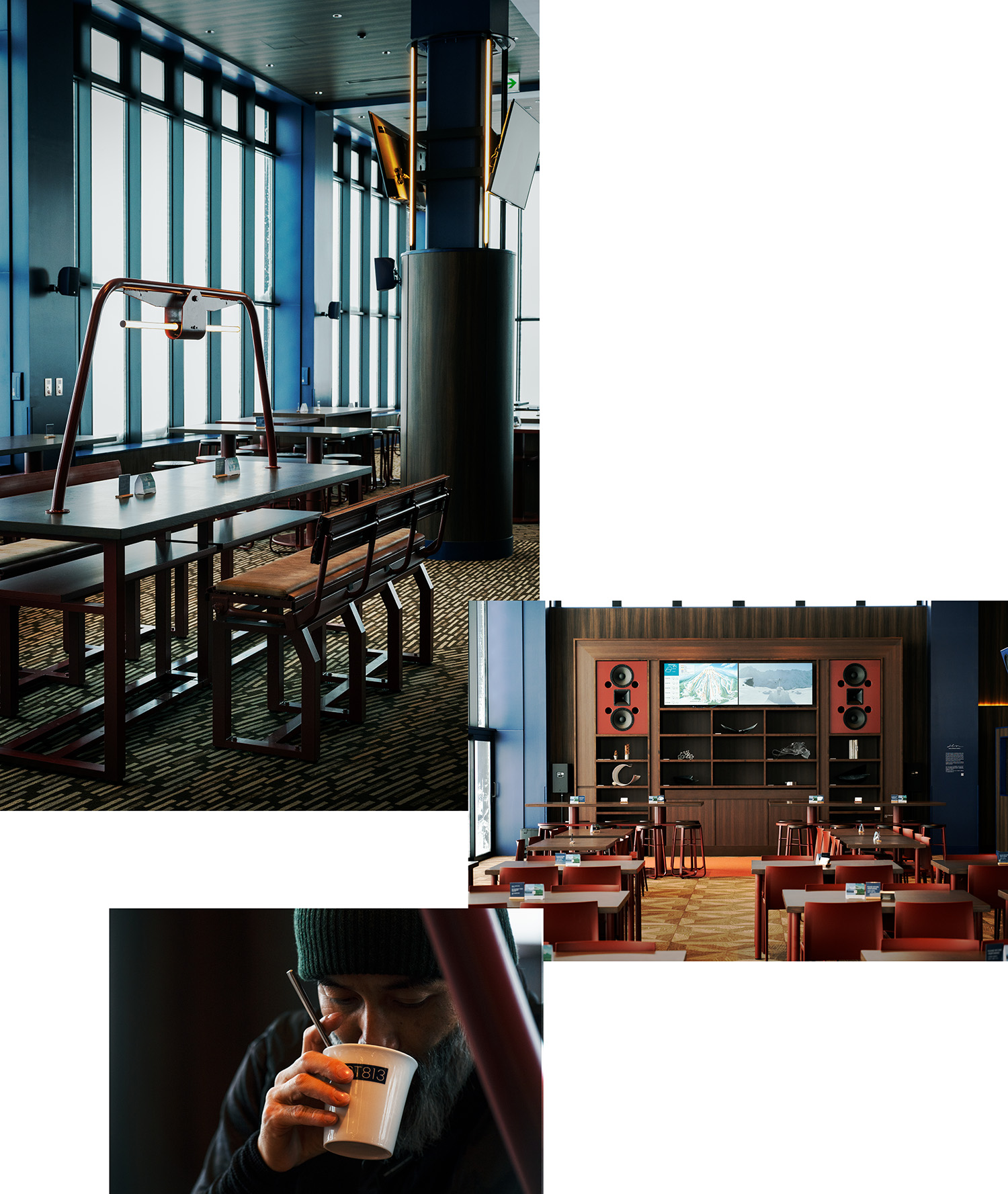 〈ニセコ東急 グラン・ヒラフ〉の新しい象徴であるエースゴンドラ山頂にあるレストラン。開放的な空間に、大きなスピーカーを設置している。店内で焼き上げたパンのほか、コーンスープや和牛ローストビーフなど、アクティビティの途中にカロリー補給できるメニューが並ぶ。モーニングからアプレまで楽しめる。813という数字は、標高813mから。かつて活躍した〈センターフォー〉のリフトを使った座席に、ニセコの進化を感じる。